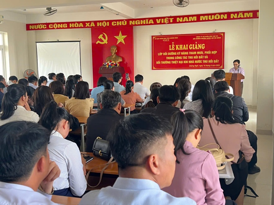 Sở Nội vụ phối hợp với Công ty cổ phần đào tạo và bồi dưỡng nguồn nhân lực Đà Nẵng tổ chức Lớp Bồi dưỡng kỹ năng tham mưu, phối hợp trong công tác thu hồi đất và bồi thường thiệt hại khi nhà nước thu hồi đất cho hơn 100 học viên là cán bộ, công chức, viên chức và cán bộ, công chức cấp xã đang công tác tại các cơ quan, đơn vị, địa phương trên địa bàn tỉnh Quảng Ngãi; lớp học được tổ chức từ ngày 16/4/2025 đến ngày 18/4/2025 theo hình thức học tập trung tại Trường Cao đẳng Công thương Thành phố Hồ Chí Minh - Cơ sở đào tạo tại Quảng Ngãi.