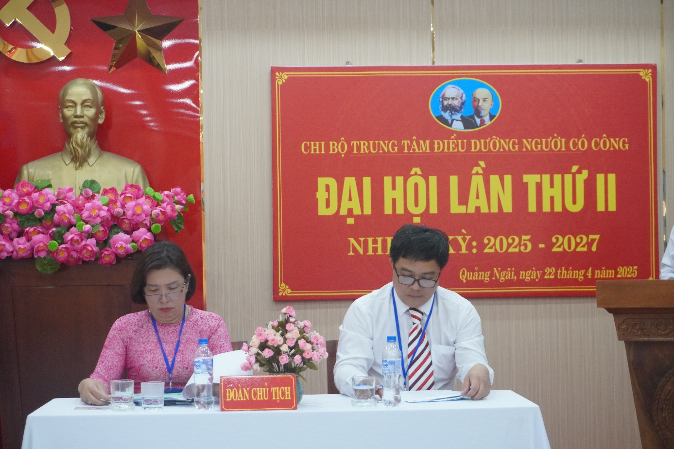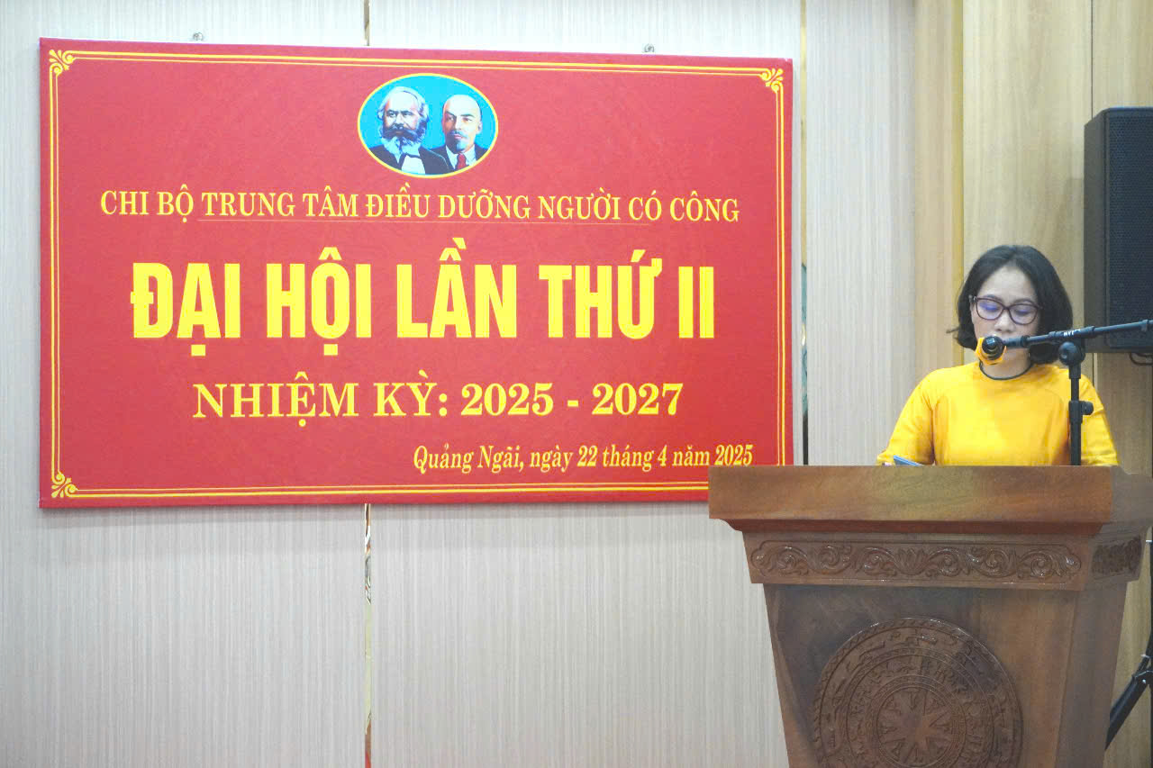 Được sự thống nhất của Đảng uỷ Sở Nội vụ, ngày 22/4/2025 Chi bộ Trung tâm Điều dưỡng Người có công tỉnh Quảng Ngãi long trọng tổ chức Đại hội Chi bộ Trung tâm Điều dưỡng Người có công, nhiệm kỳ 2025 - 2027, Đại hội vinh dự được đón tiếp đồng chí Đinh Thị Trà, Đảng Uỷ viên Ban Chấp hành Đảng uỷ Sở, Phó Giám đốc Sở Nội vụ đến dự và chỉ đạo Đại hội.