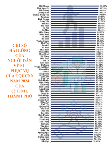 Kết quả Chỉ số SIPAS năm 2024 đạt trung bình là 83,94%, tăng 1.28% so với năm 2023. Mức độ hài lòng (MĐHL) của người dân đối với việc xây dựng, tổ chức thực hiện chính sách nói chung, năm 2024 đạt 83,84%, tăng 1.35% so với năm 2023. MĐHL về cung ứng dịch vụ hành chính công năm 2024 đạt 84,09%, tăng 1,12%.