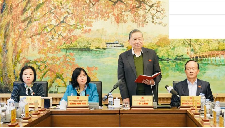 Chủ trì phiên thảo luận tổ tại Đoàn đại biểu Quốc hội TP Hà Nội có Tổng Bí thư Tô Lâm; Ủy viên Bộ Chính trị, Bí thư Thành ủy Bùi Thị Minh Hoài - Trưởng đoàn đại biểu Quốc hội TP Hà Nội; Phó Bí thư Thành ủy, Chủ tịch HĐND TP Nguyễn Ngọc Tuấn - Phó Trưởng đoàn đại biểu Quốc hội TP Hà Nội; Phó Trưởng đoàn chuyên trách Đoàn đại biểu Quốc hội TP Hà Nội Phạm Thị Thanh Mai.