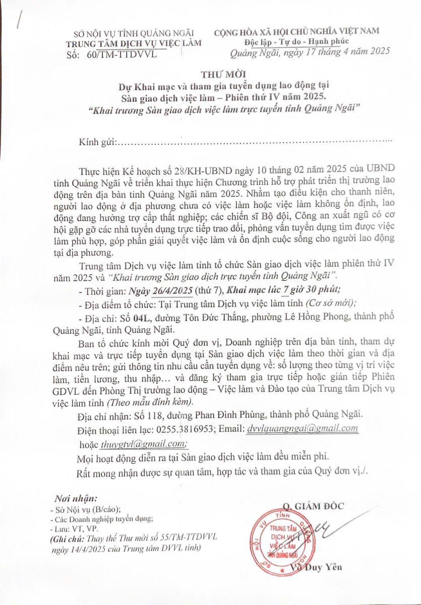 THƯ MỜI THAM GIA TUYỂN DỤNG LAO ĐỘNG TẠI SÀN GIAO DỊCH VIỆC LÀM PHIÊN THỨ 4 NĂM 2025 " .KHAI TRƯƠNG SÀN GIAO DỊCH VIỆC LÀM TRỰC TUYẾN TỈNH QUẢNG NGÃI