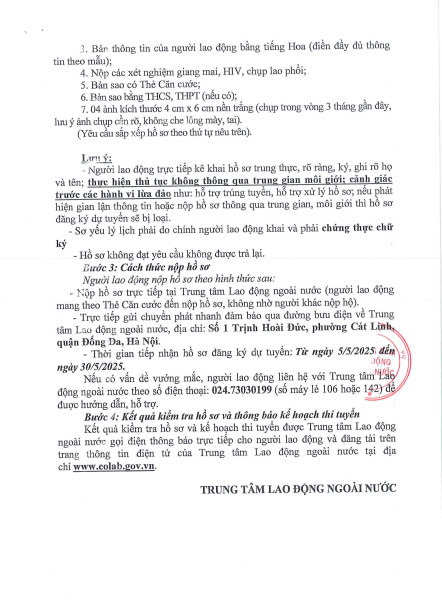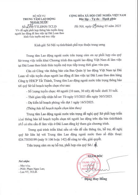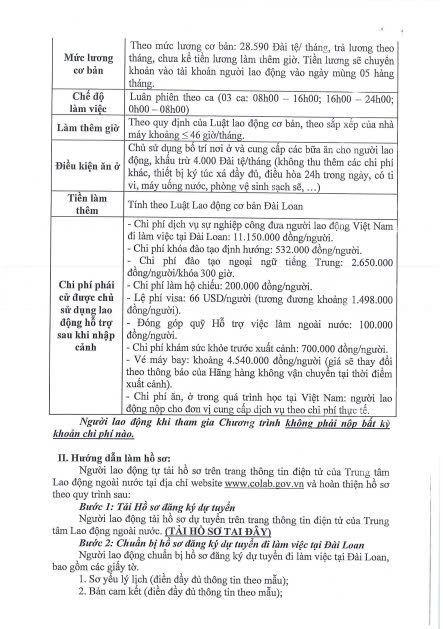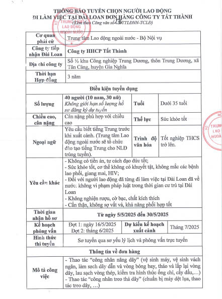 Thông báo tuyển dụng người lao động đi làm việc tại Đài Loan theo hình thức tuyển mộ trực tiếp