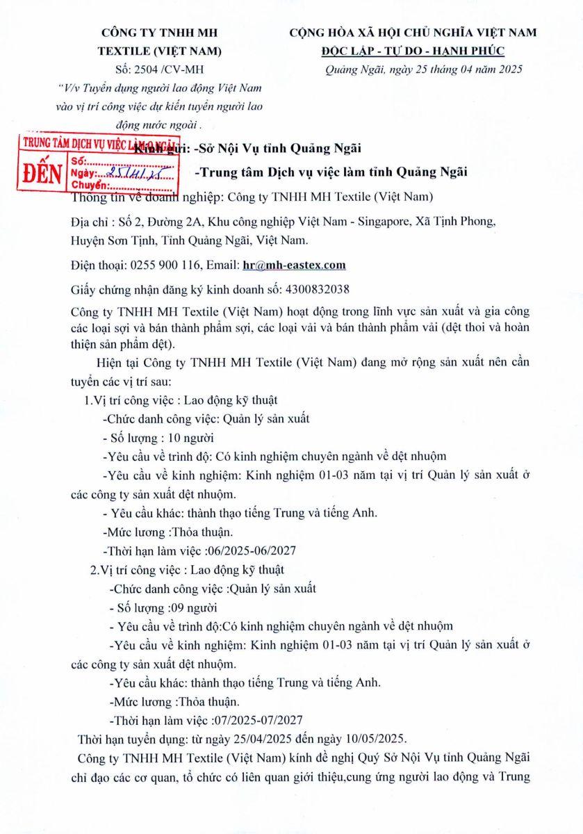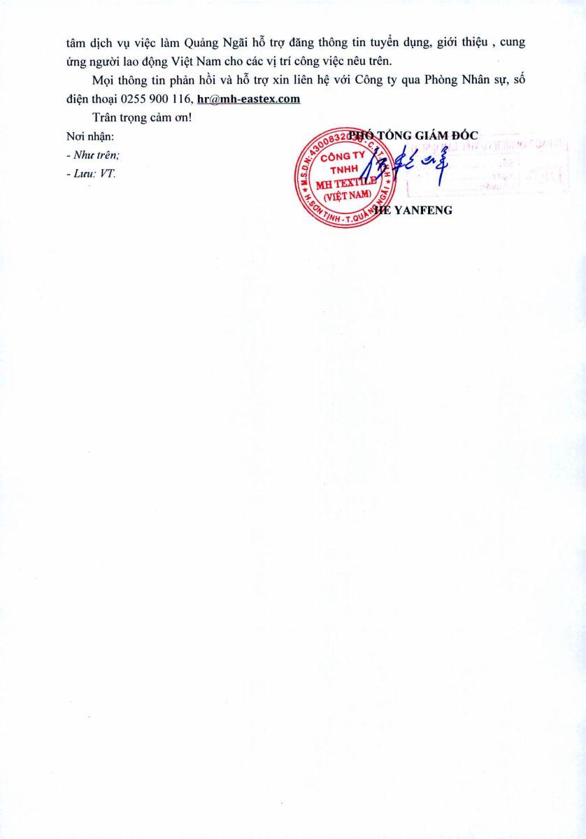 THÔNG BÁO TUYỂN DỤNG NGƯỜI LAO ĐỘNG VIỆT NAM VÀO VỊ TRÍ CÔNG VIỆC DỰ KIẾN TUYỂN NGƯỜI LAO ĐỘNG NƯỚC NGOÀI ( CÔNG TY TNHH MH TEXTILE )