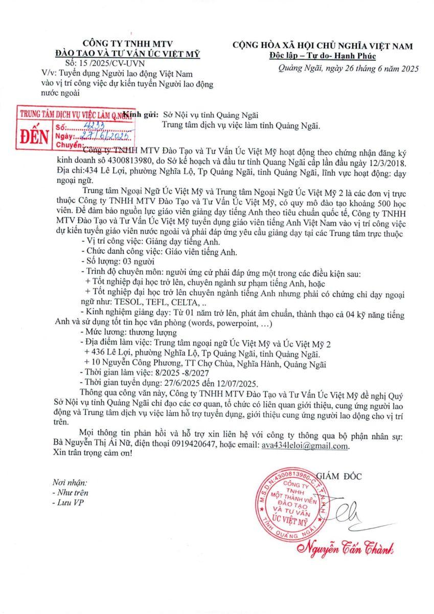 THÔNG BÁO TUYỂN DỤNG NGƯỜI LAO ĐỘNG VIỆT NAM VÀO VỊ TRÍ CÔNG VIỆC DỰ KIẾN TUYỂN NGƯỜI LAO ĐỘNG NƯỚC NGOÀI ( CÔNG TY TNHH MTV ĐÀO TẠO VÀ TƯ VẤN ÚC VIỆT MỸ )