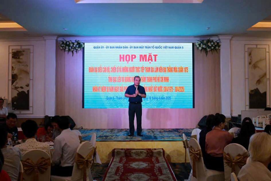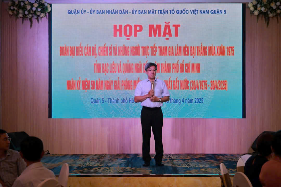 Tại buổi gặp mặt, đồng chí Nguyễn Võ Xuân Kỳ – Quận ủy viên, Phó Chủ tịch Ủy ban nhân dân Quận 5 bày tỏ niềm vinh dự khi được UBND TP HCM uỷ quyền đón tiếp các cô chú, những người đã có nhiều cống hiến cho sự nghiệp hòa bình, giải phóng đất nước nói chung, Thành phố Hồ Chí Minh và Quận 5 nói riêng. Đồng chí đã giới thiệu sơ lược về các di tích lịch sử tiêu biểu của Quận 5, đồng chí gửi lời kính chúc sức khỏe đến các đại biểu và bày tỏ mong muốn Quận 5 sẽ tiếp tục được đón tiếp các cô chú trong thời gian tới. Lãnh đạo Quận 5 đã trao tặng các phần quà ý nghĩa đến cán bộ, chiến sĩ có nhiều đóng góp cho thắng lợi lịch sử của dân tộc, đồng thời gửi lời tri ân sâu sắc đến các đại biểu tỉnh Quảng Ngãi tham gia hành trình và tặng quà lưu niệm đến các đại biểu tham dự.